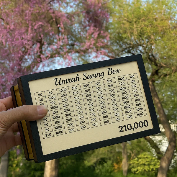 Begin your sacred preparation for Umrah or Hajj with our beautifully crafted Wooden Umrah Saving Box, designed to help you reach your financial goal of 210,000 PKR with clarity and motivation. Featuring a sleek black wooden frame and a printed savings grid with pre-filled denominations, this money box is both a practical tool and a daily reminder of your spiritual journey.